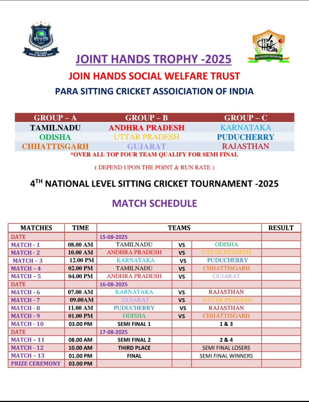 4 th NATIONAL LEVEL SITTING CRICKET CHAMPIONSHIP -2025. MATCH SCHEDULE